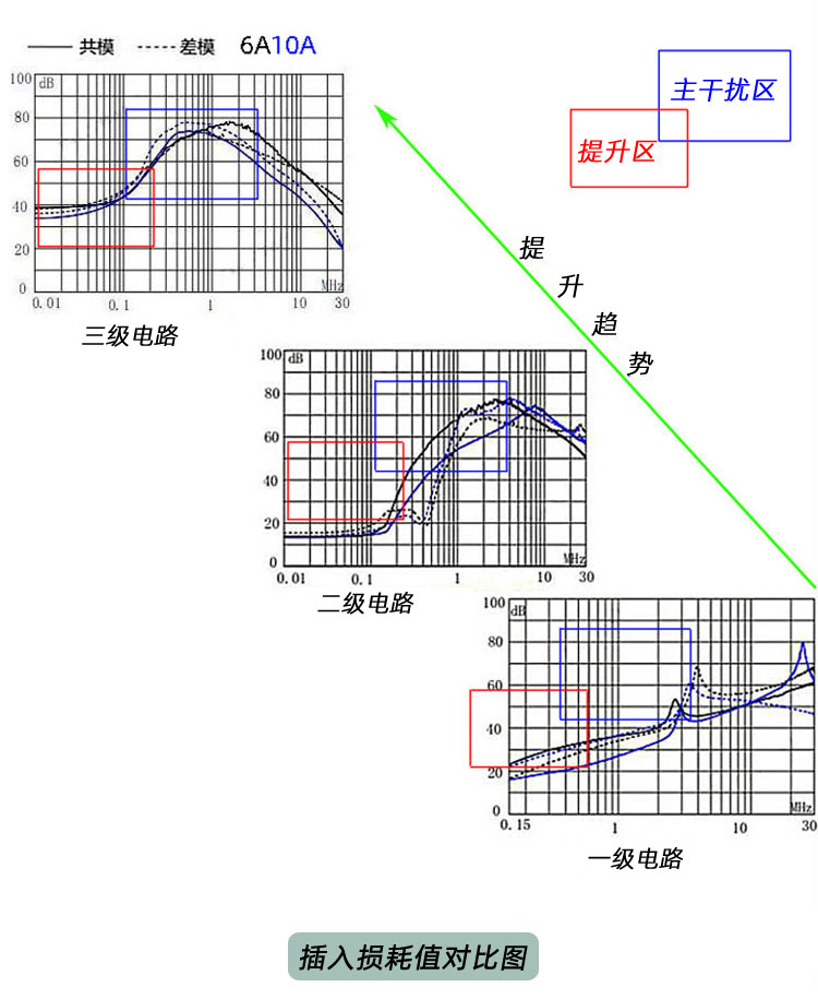 3. 關(guān)鍵性能對比,插入損耗圖(濾波衰減特性圖),三級電路低頻段和高頻段平均值更高,表現(xiàn)更均衡,屬于優(yōu)等生,另外兩個就差強人意了,屬于偏科生。