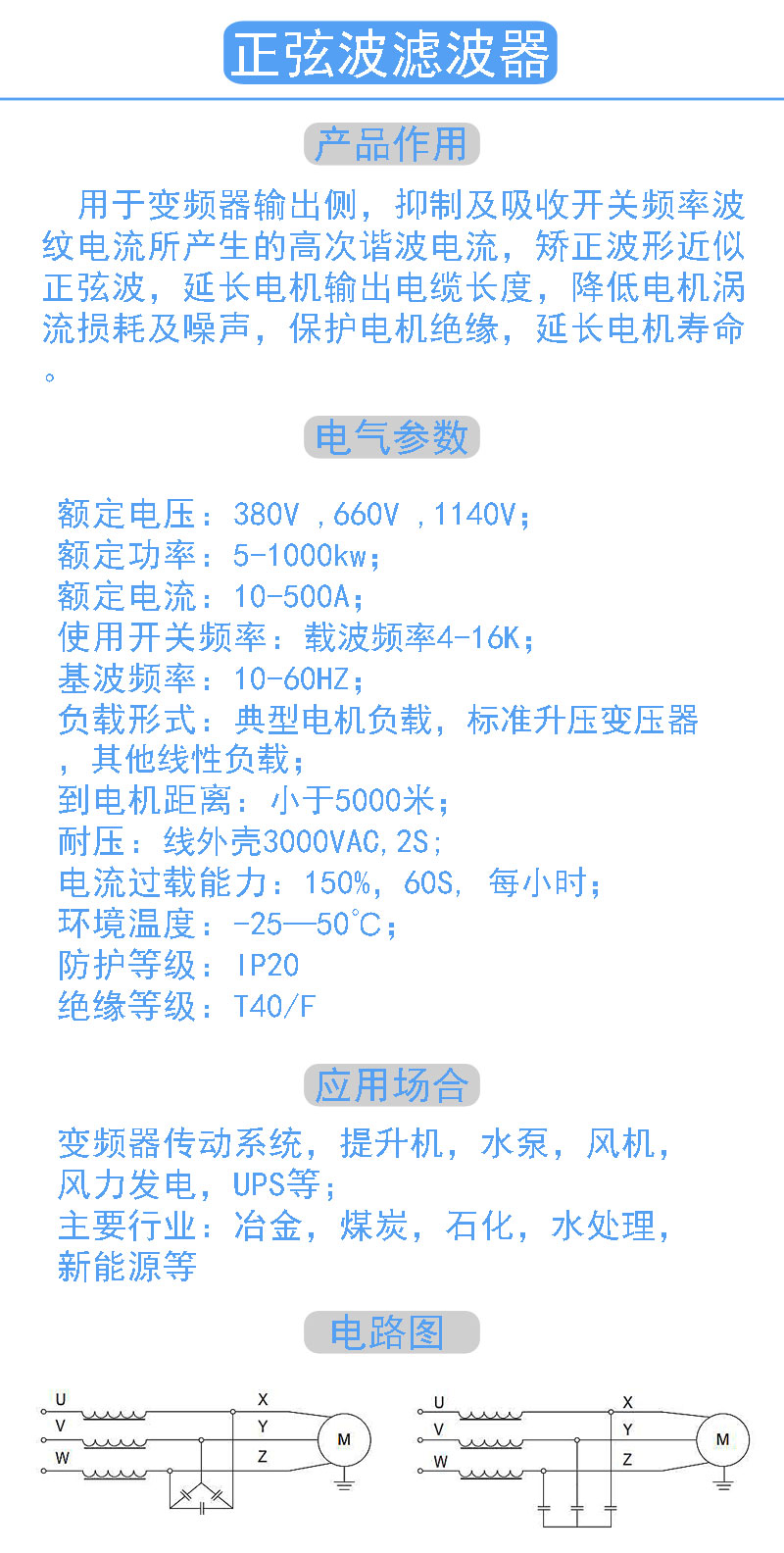 正弦波濾波器用于變頻器輸出側(cè),抑制和吸收開關(guān)頻率波紋電流所產(chǎn)生的高次諧波電流,矯正波形近似正弦波,延長電機輸出電纜長度,降低電機渦流損耗及噪聲,保護電機絕緣,延長電機壽命。